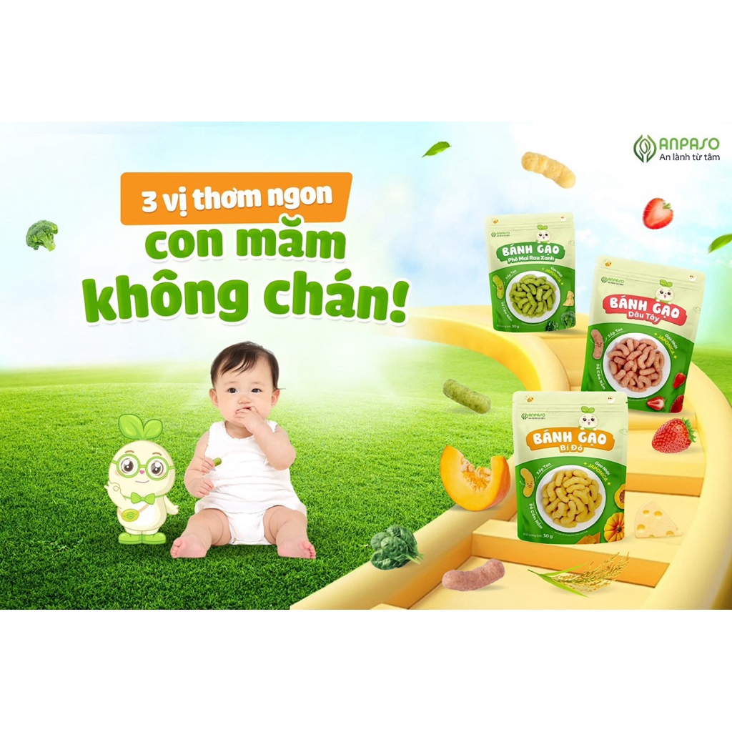 BÁNH GẠO HÌNH QUE ANPASO: 3 VỊ THƠM NGON, CON MĂM KHÔNG CHÁN!👌 Bánh gạo hình que Anpaso ra đời với 3 vị thơm ngon - để mỗi bữa phụ của con luôn là một trải nghiệm dễ chịu và vui vẻ.🍓 Bánh gạo hình que vị Dâu tây: Chua ngọt tự nhiên, thơm nhẹ, không gắt.👉 Bánh vừa cho vào miệng là tan nhanh, để lại dư vị mát lành khiến con muốn măm thêm chiếc nữa!👉 Phù hợp với những bé thích vị trái cây, dễ làm quen ngay từ lần đầu.🎃 Bánh gạo hình que vị Bí đỏ: Quen thuộc với bé, vị bùi béo nhẹ, ngọt tự nhiên.👉 Giống như hương vị những bữa cháo bí đỏ đầu đời, giúp con ăn ngon và cảm thấy thật “quen miệng”!👉 Phù hợp với bé mới tập ăn, bé yêu thích vị rau củ truyền thống.🧀🥦 Bánh gạo hình que vị Phomai Rau Xanh: Béo nhẹ hòa cùng rau xanh thanh mát, tạo nên vị bánh vừa thơm vừa dễ ăn.👉 Bí kíp khéo léo để con làm quen với vị rau mà không hề “khó chịu”!👉 Phù hợp cho bé cần đổi vị, tập ăn đa dạng hơn mỗi ngày.🫶 Bánh gạo hình que Anpaso giòn xốp tan nhanh, an lành mẹ yên tâm với:✔ Thành phần làm từ Gạo Nhật Japonica: vị ngọt tự nhiên, thanh nhẹ, đúng gu khẩu vị của bé.✔ Không đường tinh luyện, thay bằng đường thốt nốt tự nhiên tạo vị ngọt nhẹ nhàng cuốn hút bé yêu✔ Hình que vừa tay: con tự cầm, tự ăn, tập vận động tinh ngay từ sớm.✔ Kết cấu xốp, tan nhanh: êm nướu, thân thiện vòm họng của các bé mới tập ăn dặm.Từ nền gạo thơm lành ấy, Anpaso khéo léo kết hợp cùng rau củ & trái cây tự nhiên, tạo nên những chiếc bánh gạo:🌱 Xốp nhẹ, tan nhanh trong miệng, thân thiện với nướu và vòm họng non nớt🌱 Thơm ngọt tự nhiên, giữ trọn hương vị nguyên bản của nguyên liệu🌱 Dễ cầm, dễ ăn, giúp bé vừa măm măm vui vẻ, vừa tập luyện kỹ năng cầm nắm🌱 Ba hương vị quen mà không chán: • Dâu tây dịu ngọt, thơm ngon • Bí đỏ bùi bùi, dễ ăn • Phô mai rau xanh béo nhẹ, hấp dẫn