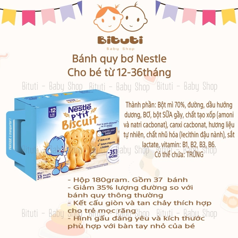 Từ 12 tháng tuổi, bánh quy được thiết kế đặc biệt dành cho bé để trở thành bữa sáng hoặc bữa ăn nhẹ ngon miệng và phù hợp.Kết cấu giòn sau đó tan chảy trong miệng.Hình dạng lý tưởng cho bàn tay nhỏ béDạng thực tế: 8 túi gồm 2 chiếc bánh quy để mang đi khắp mọi nơi.Thành phần: Bột mì (GLUTEN) 57% - đường - tinh bột lúa mì (GLUTEN) - bơ (SỮA) 13,6% - TRỨNG - bột nở: natri cacbonat, kali tartrat - chất điều chỉnh độ axit: natri cacbonat canxi - hương vị tự nhiên - vitamin B1. Dấu vết của ĐẬU NÀNH, HẠT và MÈ.Chứa: Trứng, GLUTEN, SỮACó thể chứa: Các sản phẩm từ mè và mè, ĐẬU NÀNH, HẠTBánh quy P'TIT BISCUIT, loại bánh quy đặc biệt dành cho trẻ sơ sinh giàu lúa mì và giảm 35% lượng đường cho bữa sáng hoặc bữa ăn nhẹ cân bằng, bên cạnh sữa thông thường hoặc một hũ trái cây nghiền nhỏ. Bánh quy Petit Beurre de Blédina : một ít bơ được thiết kế đặc biệt dành cho bé từ 12 tháng tuổi, cho bữa sáng hoặc bữa ăn nhẹ thơm ngon và phù hợp . Kết cấu giòn tan trong miệng sẽ đồng hành cùng bé trong quá trình khám phá các kết cấu mới . Kết cấu giòn sau đó tan chảy trong miệngHình dạng lý tưởng cho bàn tay nhỏDạng túi tiện dụng để mang đi mọi nơi