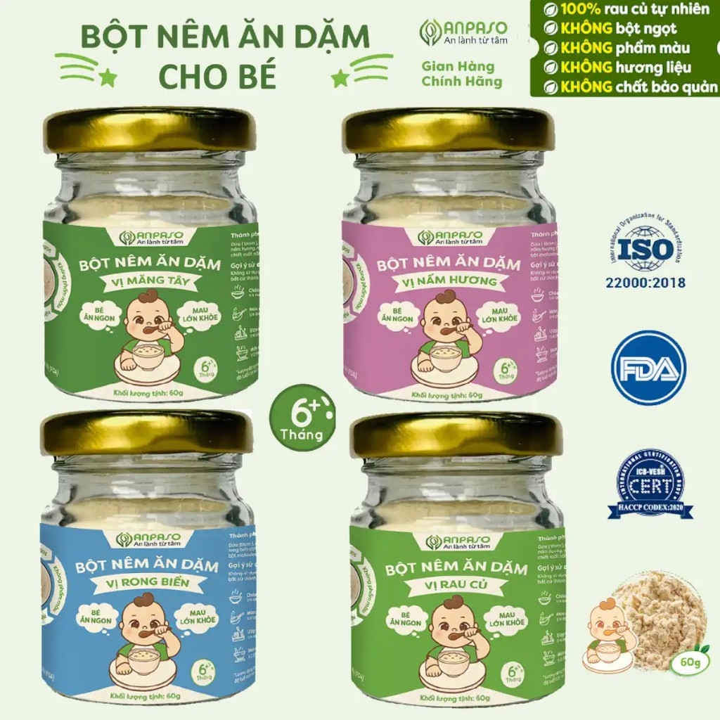 Hạt Nêm Cho Bé Ăn Dặm Anpaso - Bột Nêm Vị Rau Củ Nấm Hương Măng Tây Rong Biển Tự Nhiên - Gia Vị Ăn Dặm Cho BéTHÔNG TIN SẢN PHẨM:- Thương hiệu: ANPASO- Xuất xứ: Việt Nam- Trọng lượng: 60g - Đặc điểm của hạt nêm Anpaso:+ KHÔNG CHỨA MUỐI, ĐƯỜNG BỔ SUNG (thành phần cần hạn chế tối đa trong giai đoạn đầu phát triển của trẻ) thay vào đó sử dụng vị ngọt và mặn từ cỏ ngọt và lượng muối có sẵn trong rau củ.+ 4 KHÔNG: Không bột ngọt, không phẩm màu, không hương hiệu, không chất bảo quản- Phân loại: Hạt nêm ăn dặm Anpaso dạng bột có 4 hương vị: Vị rau củ, Vị rong biển, Vị nấm hương, Vị măng tây - Ngày sản xuất: In trên bao bì- Hạn sử dụng: 12 tháng kể từ ngày sản xuấtĐỐI TƯỢNG SỬ DỤNG• Phù hợp với mọi đối tượng, trừ trẻ nhỏ dưới 6 tháng tuổi (Đồ ăn dặm cho bé 6 tháng) • Đặc biệt phù hợp với trẻ trong độ tuổi ăn dặm (>6 tháng tuổi), đang tập nhai, làm quen với các món ăn có độ đặc, sánh hơn so với sữa• Sử dụng thích hợp cho người ăn kiêng, giảm thiểu đường, muối.• Sản phẩm có thể dùng kết hợp nấu cho cả gia đình, cả món chay và món mặnHạt Nêm Cho Bé Ăn Dặm Anpaso, Bột nêm Vị Rau Củ, Nấm hương, măng tây, rong biển Tự Nhiên, Gia vị ăn dặm cho bé THÀNH PHẦN:- Thành phần chung: Dứa (Thơm), Củ cải đường, Cỏ ngọt, Nấm hương, Rong biển, Tinh bột sắn, Maltodextrin, Chiết xuất nấm men- Chất bột màu ngà vàng, đặc trưng của sản phẩm là màu tự nhiên của rau củ.- Trong thành phần không sử dụng muối bổ sung, mà sử dụng thành phần muối từ chính rau củ để tạo vị nêm, giúp tăng hương vị của món được nêm mà lại đảm bảo tốt hơn cho sức khỏe- Sản phẩm không sử dụng bột ngọt E621 (mì chính), bột siêu ngọt E627, E631, không sử dụng phẩm màu, hương liệu, đồng thời không sử dụng chất bảo quản nên hoàn toàn an toàn cho trẻ nhỏHƯỚNG DẪN SỬ DỤNG- Sử dụng làm gia vị nêm nếm cho các món canh, cháo, xào,... Có thể dùng để ướp thực phẩm khi muốn giảm thiểu lượng muối nạp vào cơ thể.- Gợi ý sử dụng:1. Cháo ăn dặm: 1/2 thìa cà phê cho 200ml cháo2. Món xào cho bé: 1/2 thìa cà phê cho 150g nguyên liệu3. Ướp thịt, cá, hải sản: 1/2 thìa cà phê cho 150g nguyên liệuLƯU Ý & BẢO QUẢN:- Bảo quản bột nêm nơi khô ráo, thoáng mát, tránh ánh nắng trực tiếp.- Không sử dụng sản phẩm nếu dị ứng với bất cứ thành phần nào của sản phẩm