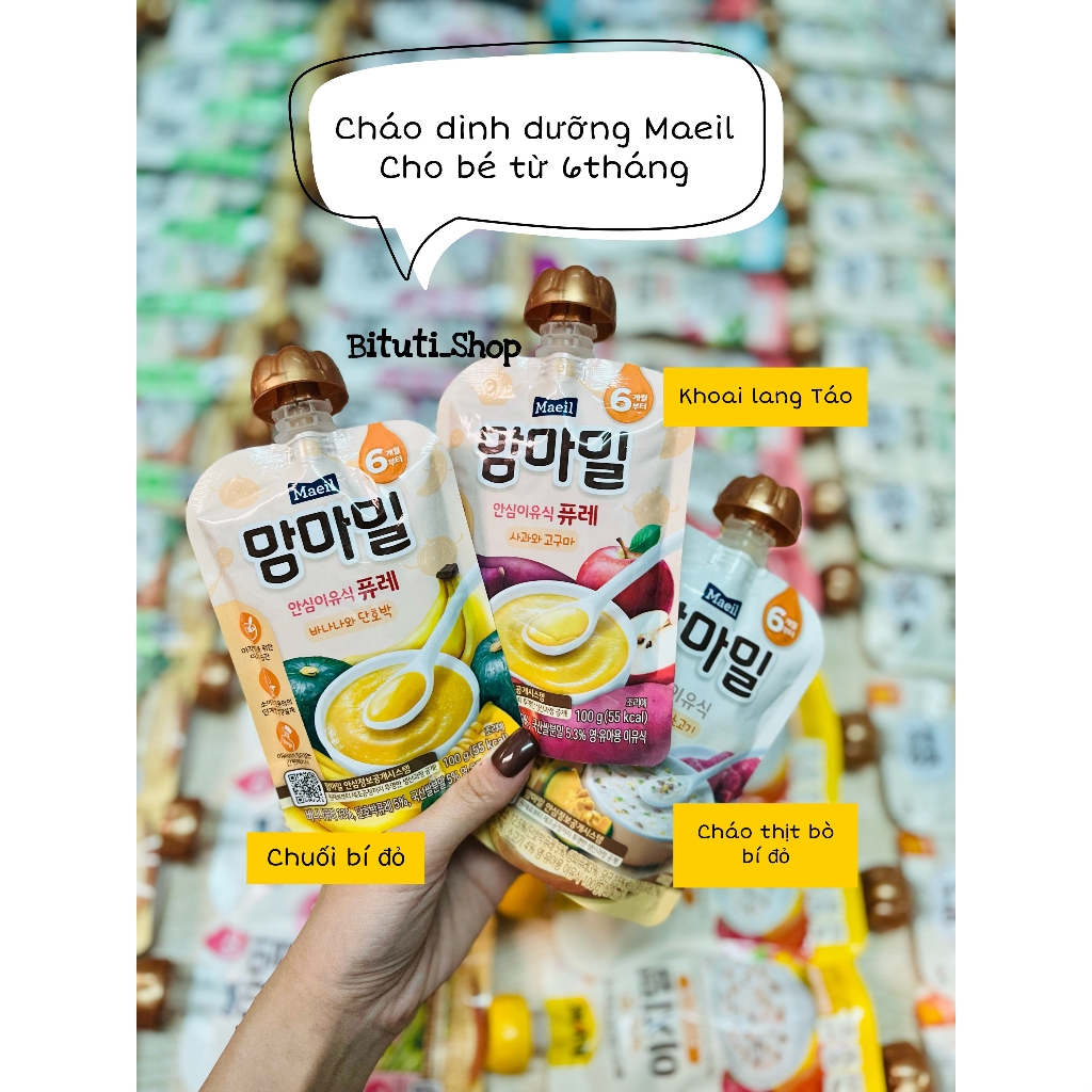 Cháo tươi ăn liền Maeil Hàn cho bé từ 6/9/12 tháng Xuất xứ: Hàn QuốcNguyên liệu tươi ngon- Cháo Maeil Mam’ma Meal được chế biến từ các nguyên liệu tươi ngon, tuyển chọn kỹ càng từ loại gạo organic và nguồn củ quả đa dạng của Hàn Quốc, đồng thời được kiểm soát dưới quy trình chế biến nghiêm ngặt, đạt chứng nhận HACCP và Traceability System, mang đến cho bé yêu một bữa ăn không những thơm ngon, dinh dưỡng mà còn tuyệt đối an toàn cho sức khỏe.- Sản phẩm không chứa các chất phụ gia độc hại, đảm bảo hương vị thơm ngon thuần túy, phù hợp với khẩu vị bé yêu.Cung cấp đầy đủ dinh dưỡng- Không chỉ được bổ sung một lượng lớn chất tinh bột cần thiết cho quá trình phát triển của bé, cháo Mam'ma Meal còn cung cấp một nguồn chất xơ và vitamin dồi dào được bổ sung hoàn hảo từ các loại rau củ tự nhiên như cà rốt, hành tây, súp lơ,...- Đặc biệt, cháo cung cấp cho bé một hàm lượng đạm vừa đủ, được lấy từ thịt bò tươi thơm ngon bổ dưỡng, cho bé hoạt động hiệu quả suốt ngày dài đồng thời giúp bé phát triển thể chất và trí não một cách toàn diện và nhanh chóng.Thiết kế dạng túi tiện lợiCháo Mam'ma Meal được đóng gói thành dạng túi tiện lợi cùng nắp vặn chắc chắn, dễ dàng cho bố mẹ mang đi trong những chuyến đi du lịch xa nhà hay sử dụng ngay trong những buổi sáng bận rộn, vô cùng thích hợp và thuận tiện.- Hâm nóng trong lò vi sóng:+ Mở nắp của sản phẩm. Cho vào lò vi sóng (đặt sản phẩm đứng thẳng) và quay trong vòng 20 giây.+ Ấn nhẹ vào vỏ sản phẩm để kiểm tra độ nóng. Có thể cho bé ăn trực tiếp hoặc dùng thìa để cho bé ăn.- Làm ấm bằng nước sôi:+ Ngâm cả túi (chưa mở nắp) trong nước vừa đun sôi trong vòng 1 phút, sau đó dùng đũa gắp vào phần nắp để nhấc túi ra ngoài.+ Mở nắp của sản phẩm, ấn nhẹ vào vỏ sản phẩm để kiểm tra độ nóng.+ Có thể cho bé ăn trực tiếp hoặc dùng thìa để cho bé ăn.Bố mẹ nên cẩn thận khi sử dụng nóng. Vui lòng kiểm tra nhiệt độ khi cho bé sử dụng. Gói cháo chỉ nên dùng một lần.Hàng pick trực tiếp từ siêu thị Hàn có kèm bill mua hàng nên các Mẹ yên tâm chọn cho bé nha-------Bituti Shop