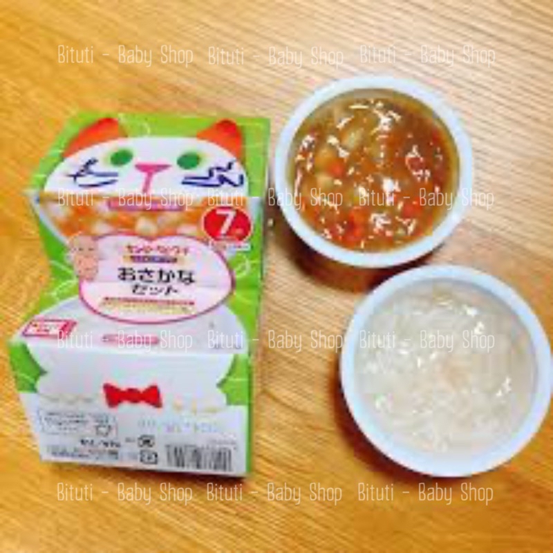 Set hộp 2 món cháo & soup hầm Kewpie cho bé từ 7-9tháng@ Set 7m gồm 2 chén 60gr: 1 chén cháo/cơm nát/mỳ & 1 chén ăn kèm là soup hầm thịt/cá cùng rau củ. @ Set 9m có 2 lại:- Hộp gồm 2 chén 60gr: 1 chén cháo/cơm nát/mỳ & 1 chén ăn kèm là soup hầm thịt/cá cùng rau củ. - Hộp gồm 2 chén 90gr: 1 chén cháo/cơm nát/mỳ & 1 chén ăn kèm là soup hầm thịt/cá cùng rau củ. Hộp giấy in hình thú vật xinh xắn màu sắc , có thể biển đổi thành con rối để bố mẹ tương tác với bé khi tập cho bé ăn. Ngon như một set “món chính” và “món ăn kèm với nhiều nguyên liệu tận dụng hương vị của nước súp và nguyên liệu.Hương vị nhẹ nhàng tương tự như "thức ăn làm tại nhà".Độ thô nhuyễn của thức ăn phù hợp với - Sẵn sàng bữa ăn cho bé ngay cả khi bạn không có thời gian: có thể hâm nóng bằng lò vi sóng・Không sử dụng màu sắc, chất bảo quản và hương liệu-----------Bituti Shop