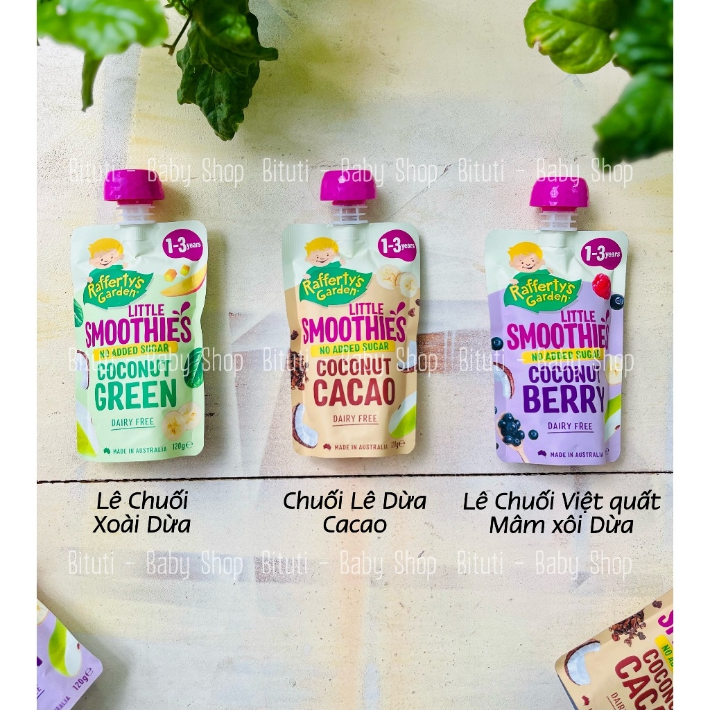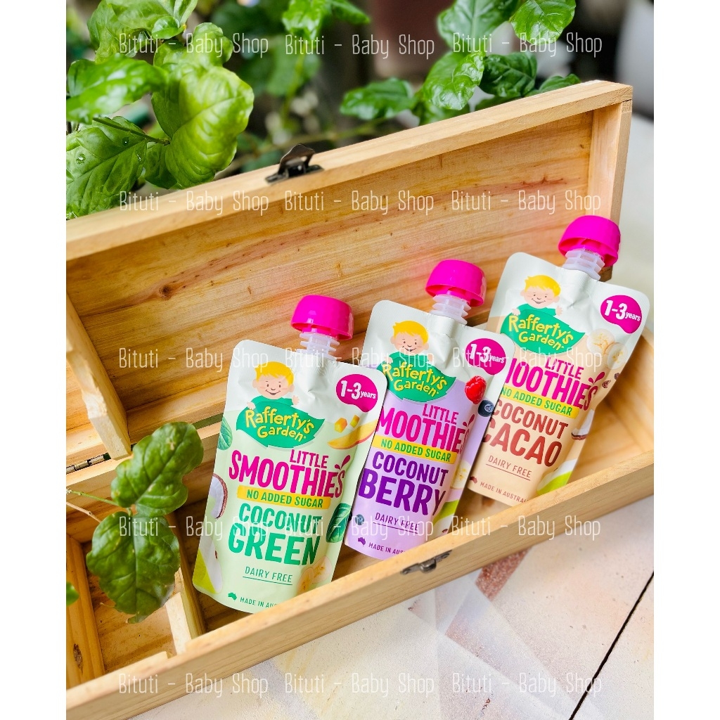 Sinh tố dừa mix trái cây hữu cơ Rafferty's Garden cho bé từ 1 tuổiXuất xứ: ÚcHSD 10/2024Sinh tố dừa mix trái cây hữu cơ Rafferty's GardenLấy cảm hứng từ hương vị dành cho người lớn và được thiết kế riêng cho từng vị giác nhỏ, Rafferty's Garden Little Smoothies có nhiều hương vị thơm ngon mà con bạn sẽ yêu thích!Món sinh tố dừa thơm ngon này không chứa sữa, không chứa thêm đường và có thêm prebiotic tốt cho sức khỏe!Thành phần: Chuối (34%)(Chuối, Axit ascorbic), Nước, Lê (24%)(Quả lê, Axit ascorbic), Kem dừa (4%), Tinh bột ngô, Bột ca cao, Bột hạt lanh, Chất xơ Prebiotic (Inulin)( 0,5%), Hương vani tự nhiên, Bột cacao (0,1%), Xanthan Gum, Axit CitricKhông chất bảo quảnKHÔNG có hương vị nhân tạoKHÔNG có màu nhân tạoKHÔNG thêm muối hoặc đườngKHÔNG thêm chất cô đặcKHÔNG có thành phần biến đổi genĐược làm bằng PrebioticSản xuất tại Úc-----------Bituti Shop