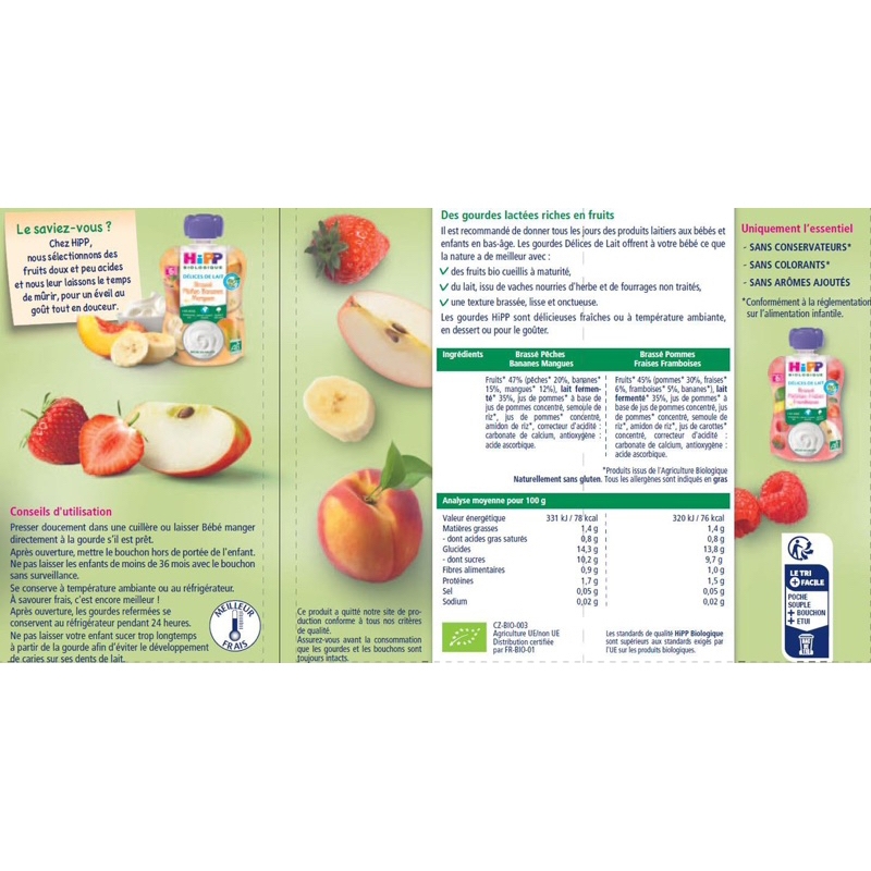 Sữa chua giàu trái cây Hipp Délices de Lait mang đến cho con bạn những điều tốt đẹp nhất mà thiên nhiên ban tặng với: ✔ trái cây hữu cơ xay nhuyễn, hái khi chín ✔ sữa từ bò ăn cỏ và thức ăn gia súc không béo đã qua chế biến, ✔ được ủ, mịn màng và kết cấu kem, ✔ không thêm đường. Thiết thực và di động, những túi sữa chua thơm ngon này sẽ đồng hành cùng Bé trong mọi chuyến đi chơi, dùng làm món tráng miệng hoặc đồ ăn nhẹ.Thành phầnĐào ủ Chuối Xoài: Trái cây* 57% (đào* 20%, chuối* 15%, xoài* 12%, nước táo* làm từ nước táo cô đặc), SỮA LÊN MEN* 35%, bột báng*, tinh bột gạo*, độ chua chất điều chỉnh: canxi cacbonat, chất chống oxy hóa: axit ascorbic. Táo ủ dâu tây Quả mâm xôi: Trái cây* 60% (táo* 30%, nước táo* làm từ nước táo cô đặc, dâu tây* 6%, quả mâm xôi* 5%, chuối*, nước táo cô đặc*), SỮA LÊN MEN* 35%, gạo bột báng*, tinh bột gạo*, nước ép cà rốt đậm đặc*, chất điều chỉnh độ axit: canxi cacbonat, chất chống oxy hóa: axit ascorbic. *Sản phẩm từ canh tác hữu cơ không chứa gluten+ 50% trái câyKHÔNG CÓ CHẤT BẢO QUẢN*, CHẤT MÀU*, TINH CHẤT BIẾN ĐỔI, HƯƠNG VỊ THÊM HOẶC ĐƯỜNG THÊM**Chứa đường tự nhiên.Món tráng miệng sữa hữu cơ thích hợp cho trẻ em. Táo mix Dâu tây Quả mâm xôi và đào mix Chuối Xoài———Bituti Shop