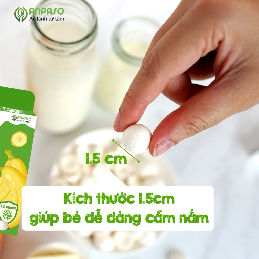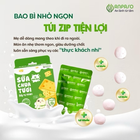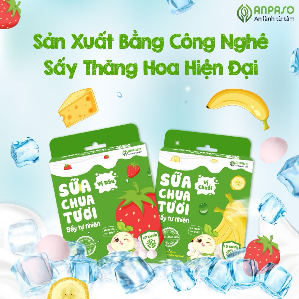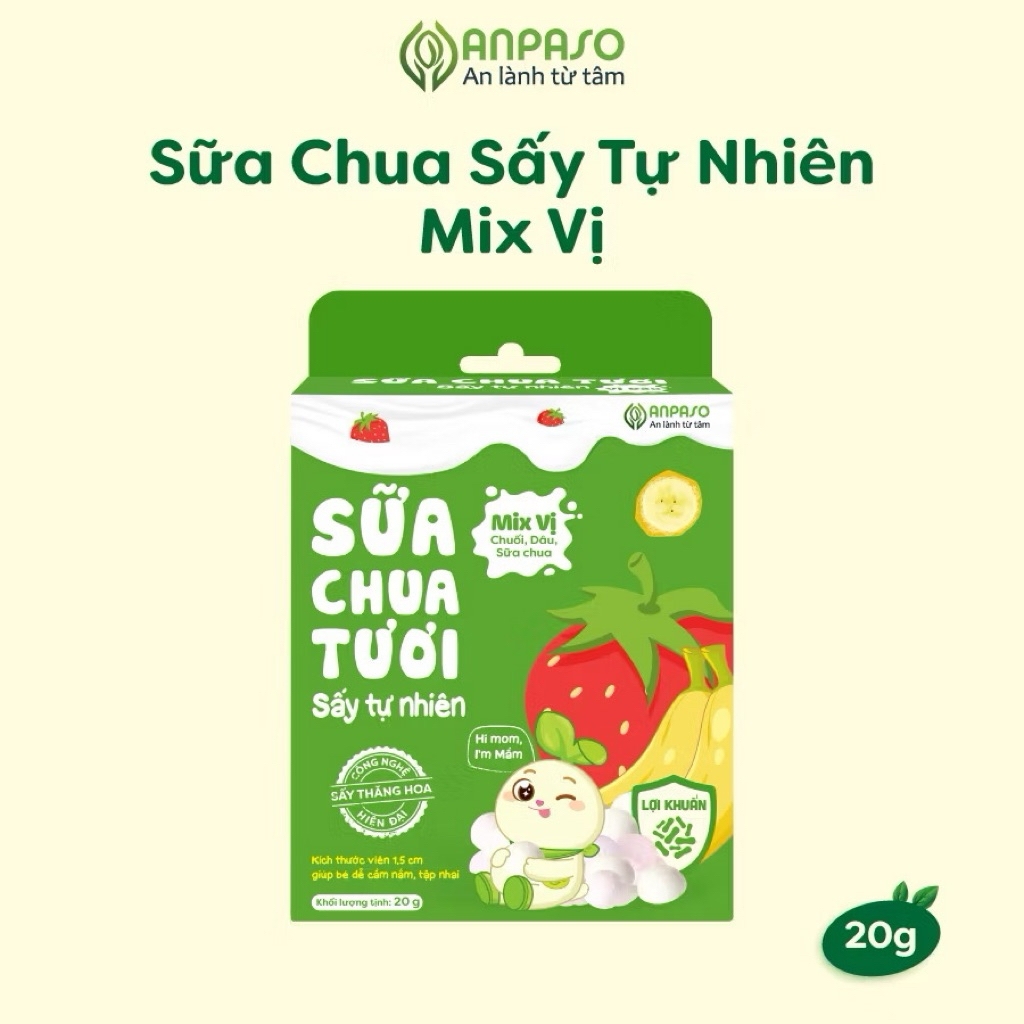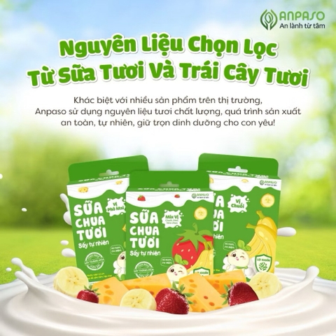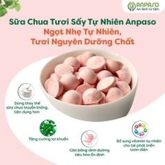 Sữa chua sấy Anpaso được làm từ sữa tươi, hoa quả tươi, chứa lợi khuẩn tự nhiên, mang đến cho bé một món ăn vặt an toàn, dinh dưỡng!