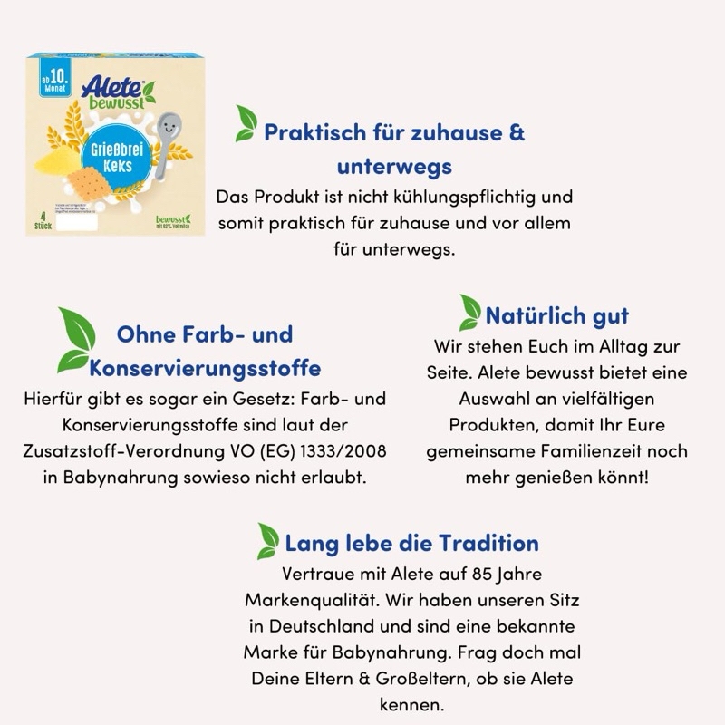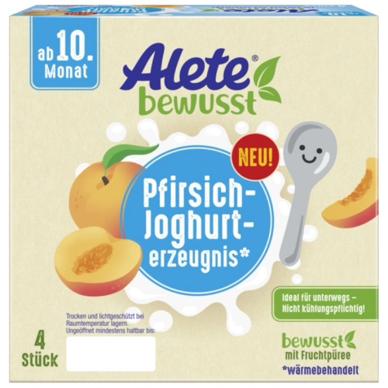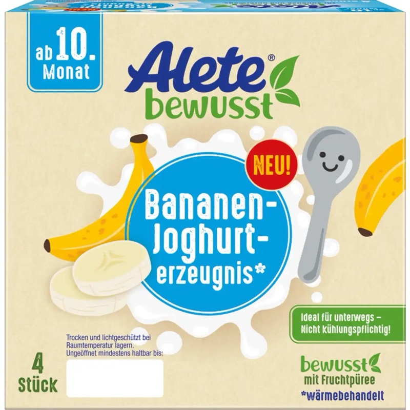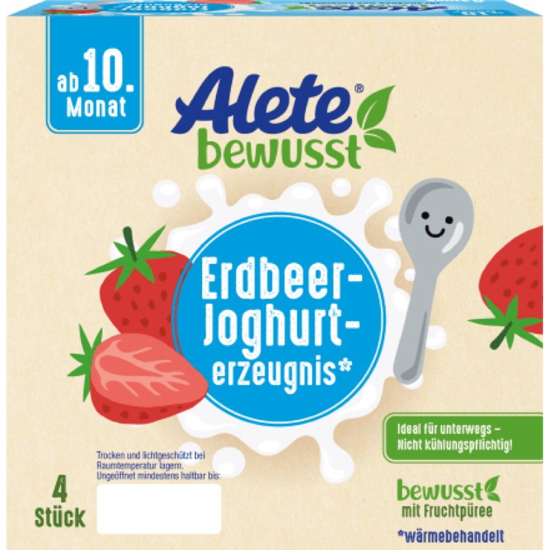Sữa chua - Váng sữa hữu cơ Alete Đức Phù hợp cho bé từ 10 tháng Lốc 4hũ x 100gramThành phần: (tham khảo vị dâu)SẢN PHẨM SỮA CHUA 76%, sốt dâu tây 10%, nước, tinh bột biến tính, đường, chất làm đặc: pectin, keo đậu carob; hương vị tự nhiênTính năng sản phẩm : Không có trứng, không thêm muốiHướng dẫn sử dụng:Các sản phẩm sữa chua Alete thích hợp cho trẻ từ tháng thứ 10 trở đi như một món tráng miệng, một món ăn nhẹ ngon miệng hoặc như một bữa ăn bổ sung cho bữa sáng. Chúng đã sẵn sàng để ăn và có thể bảo quản mà không cần làm lạnh. Điều này làm cho chúng trở nên tiện dụng khi sử dụng ở nhà và khi di chuyển. Chỉ cần mở ra và bắt đầu múc.Giá trị dinh dưỡngThông tin dinh dưỡng trung bình trên 100 gGiá trị năng lượng 322kJ/77kcalchất béo 2,7gtrong đó có: axit béo bão hòa 1,8gCarbohydrate 9,9gtrong đó có đường 7,3gChất xơ < 0,4gchất đạm 3gMuối 0,1gnatri 40mg———Bituti Shop