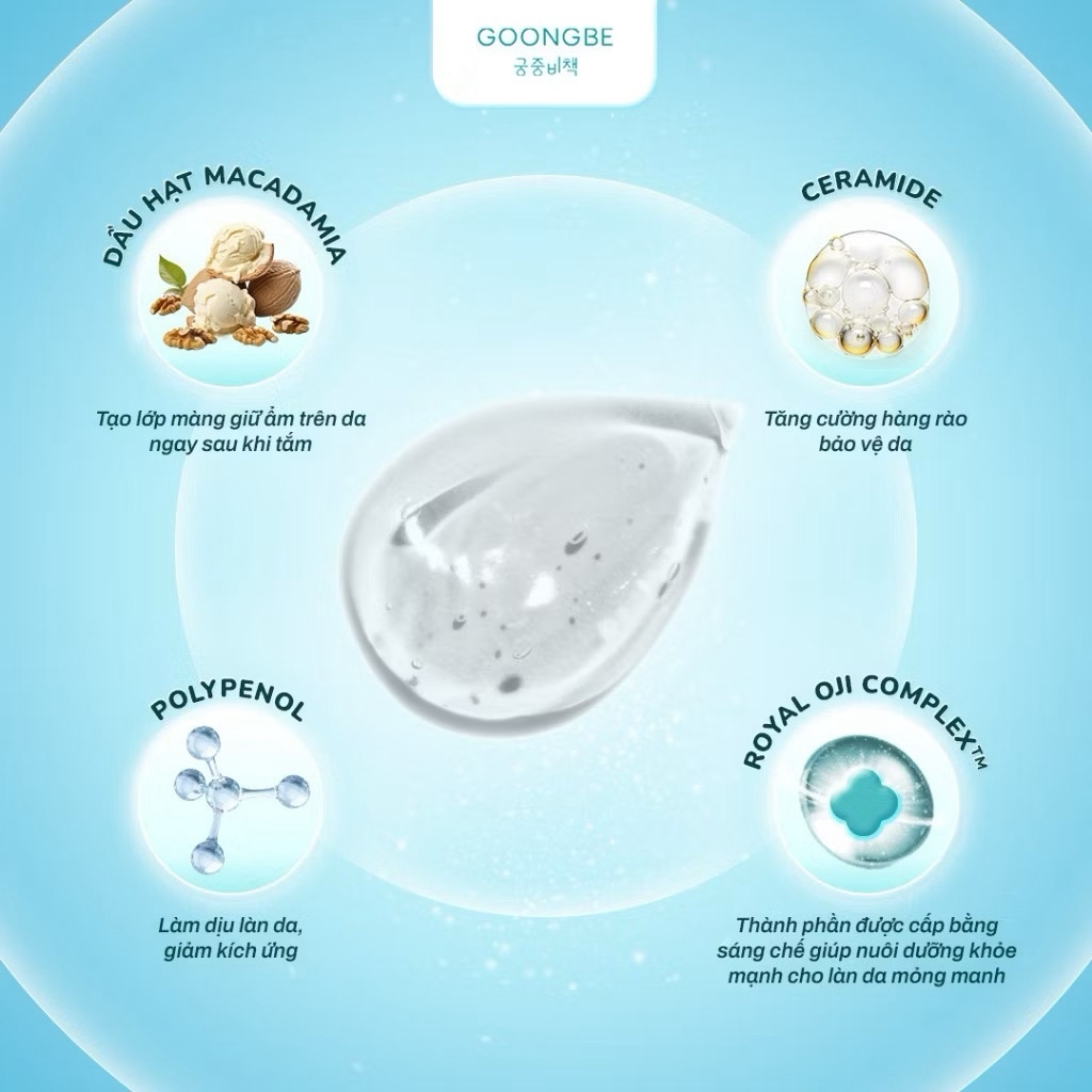 Goongbe là thương hiệu chăm sóc da trẻ em cao cấp hàng đầu Hàn Quốc, nổi tiếng với triết lý kết hợp giữa trí tuệ truyền thống và khoa học hiện đại. Dòng Pri-mmune là phiên bản nâng cấp đặc biệt, tập trung vào việc củng cố hệ miễn dịch tự nhiên cho làn da mỏng manh của bé ngay từ khi chào đời.1. Công Dụng Nổi Bật• Làm sạch 2 trong 1: Kết hợp hoàn hảo giữa dầu gội và sữa tắm, giúp làm sạch sâu bụi bẩn và cả bụi mịn (fine dust) ẩn sâu trong lỗ chân lông.• Cấp ẩm & Cân bằng pH: Với độ pH lý tưởng (4.5 \pm 1.0), sản phẩm giúp duy trì lớp màng ẩm tự nhiên, không gây khô căng sau khi tắm.• Làm dịu tức thì: Giảm thiểu các tình trạng kích ứng, mẩn đỏ nhờ các chiết xuất thảo mộc lành tính.• An toàn tuyệt đối: Công thức "Không cay mắt" và đạt chứng nhận 24-Free (không chứa 24 thành phần gây hại theo tiêu chuẩn Châu Âu).2. Thành Phần Từ Thiên NhiênSản phẩm được chiết xuất từ phức hợp thảo mộc độc quyền giúp nuôi dưỡng làn da:• Dầu hạt Yến Mạch: "Ngôi sao" trong việc dưỡng ẩm và làm dịu da khô ngứa.• Chiết xuất 5 loại cây quý: Đào (bảo vệ da), Mận (giữ nước), Dâu tằm (làm dịu), Liễu trắng (thanh lọc) và Hoa hòe (kháng khuẩn).• Ceramide NP: Giúp củng cố hàng rào bảo vệ da, ngăn chặn tác động từ môi trường.3. Đặc Điểm Bộ Sản Phẩm:• Chai lớn (350ml): Dạng vòi nhấn tiện lợi, tạo bọt mịn và xốp giúp việc tắm gội cho bé trở nên dễ dàng.• Tuýp nhỏ (30ml): bản mini tiện lợi để mang theo khi đi du lịch, về quê.4. Hướng Dẫn Sử Dụng1. Làm ướt tóc và cơ thể bé bằng nước ấm.2. Lấy một lượng vừa đủ ra lòng bàn tay hoặc bông tắm, xoa nhẹ để tạo lớp bọt mịn.3. Massage nhẹ nhàng lên tóc và da bé.4. Rửa sạch lại với nước và lau khô bằng khăn mềm.