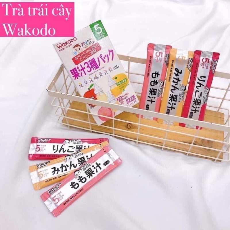 🍑 Trà trái cây Wakodo mix 3 vị táo + cam + đào (dành cho bé 5 tháng trở lên): đây là loại trà trái cây rất được các bé yêu thích vì vị ngọt dịu thơm ngon, giúp bổ sung thêm chất xơ và vitamin cho cơ thể bé