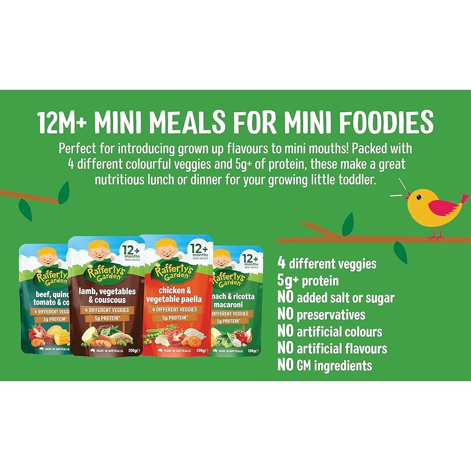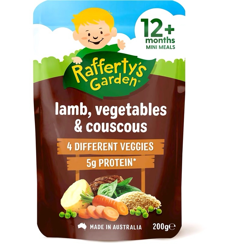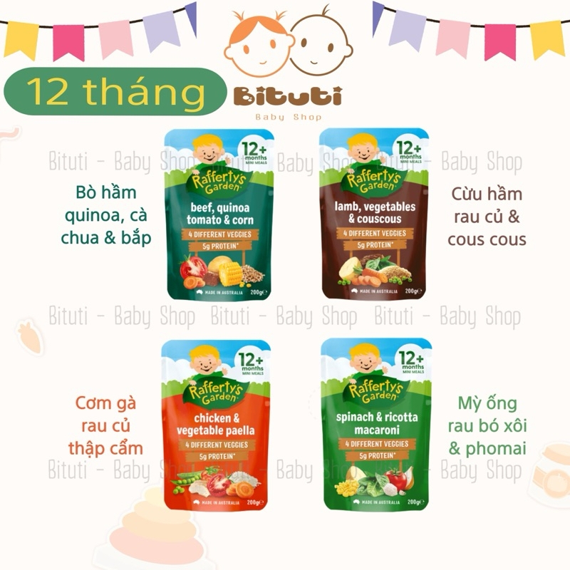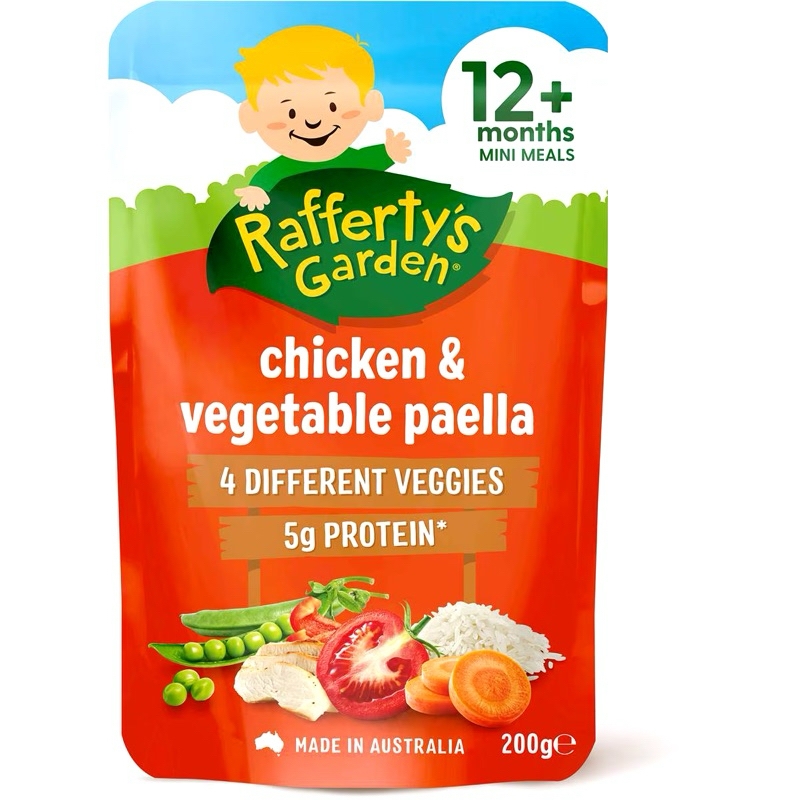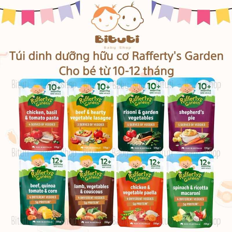 Túi dinh dưỡng hữu cơ vị mặn Rafferty’s Garden cho bé từ 10-12 thángXuất xứ: ÚcTrọng lượng : - Túi 10m 170gram, Túi 12m 200grKhi bé được hơn 10 tháng tuổi, bạn sẽ tiếp tục giới thiệu các kết cấu và hương vị mới vào chế độ ăn của bé.Con bạn sẽ độc lập hơn nhiều khi được 10 tháng tuổi, muốn tự ăn và quyết định loại thực phẩm nào mình muốn ăn Bữa ăn nhỏ dành cho bé từ 10 tháng tuổi trở lên của Rafferty's Garden là lựa chọn bữa trưa và bữa tối ngon miệng và bổ dưỡng cho bé.Tự hào được sản xuất tại Úc, chứa đầy đủ chất dinh dưỡng từ thịt và rau, với các lựa chọn dành cho người ăn chay và hương vị mà bé sẽ thích nên bé sẽ không phải thất vọng!