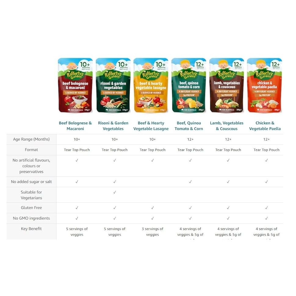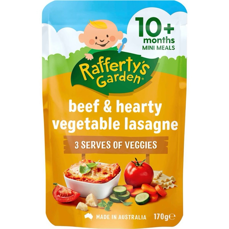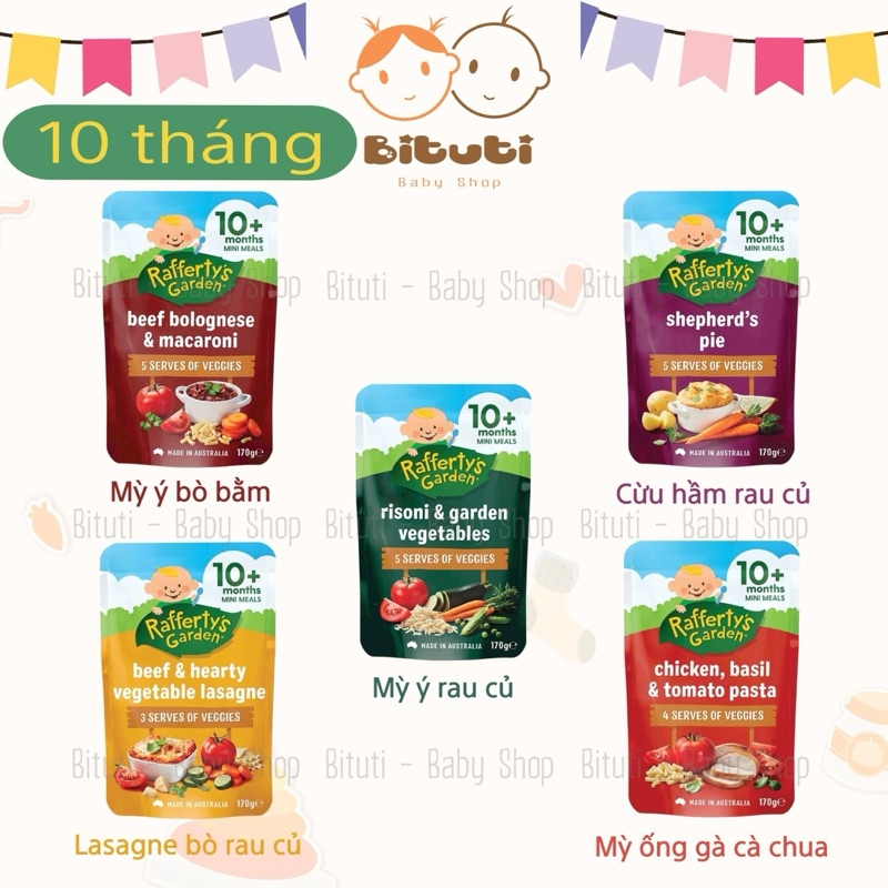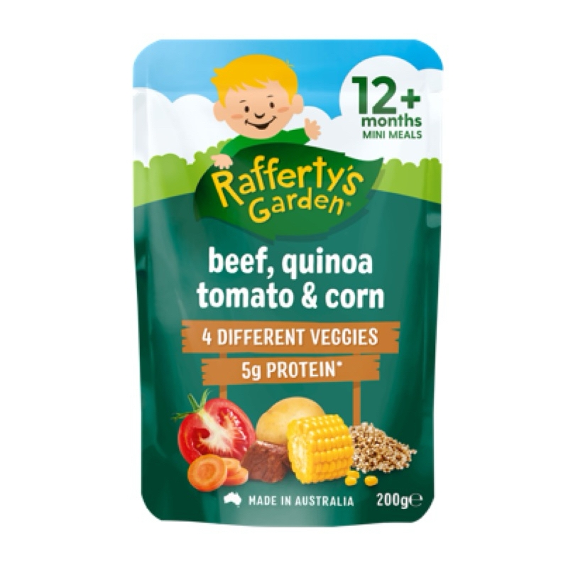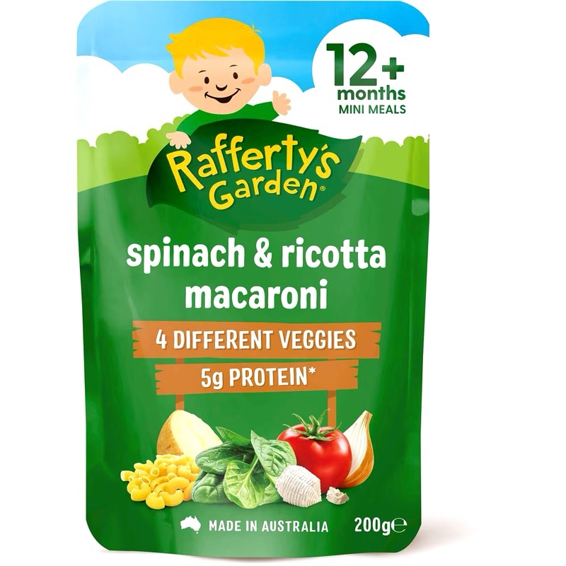 Túi dinh dưỡng hữu cơ vị mặn Rafferty’s Garden cho bé từ 10-12 thángXuất xứ: ÚcTrọng lượng : - Túi 10m 170gram, Túi 12m 200grKhi bé được hơn 10 tháng tuổi, bạn sẽ tiếp tục giới thiệu các kết cấu và hương vị mới vào chế độ ăn của bé.Con bạn sẽ độc lập hơn nhiều khi được 10 tháng tuổi, muốn tự ăn và quyết định loại thực phẩm nào mình muốn ăn Bữa ăn nhỏ dành cho bé từ 10 tháng tuổi trở lên của Rafferty's Garden là lựa chọn bữa trưa và bữa tối ngon miệng và bổ dưỡng cho bé.Tự hào được sản xuất tại Úc, chứa đầy đủ chất dinh dưỡng từ thịt và rau, với các lựa chọn dành cho người ăn chay và hương vị mà bé sẽ thích nên bé sẽ không phải thất vọng!